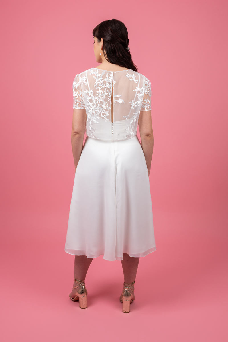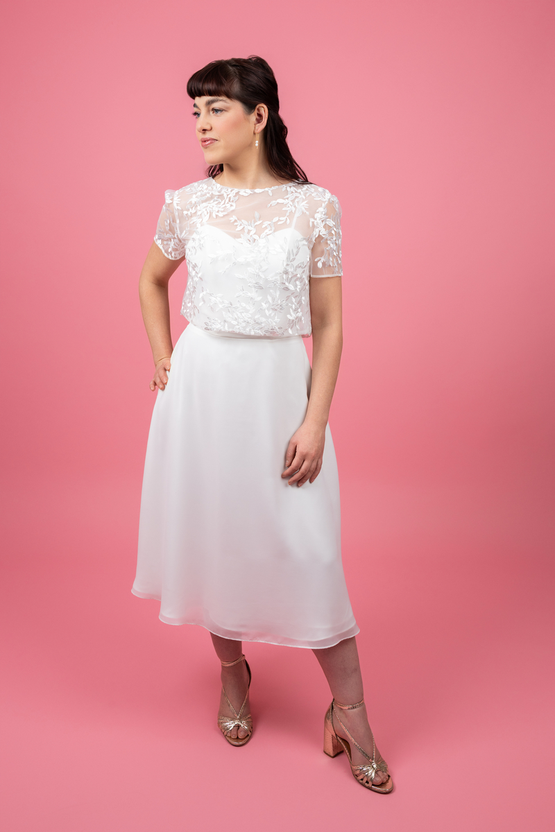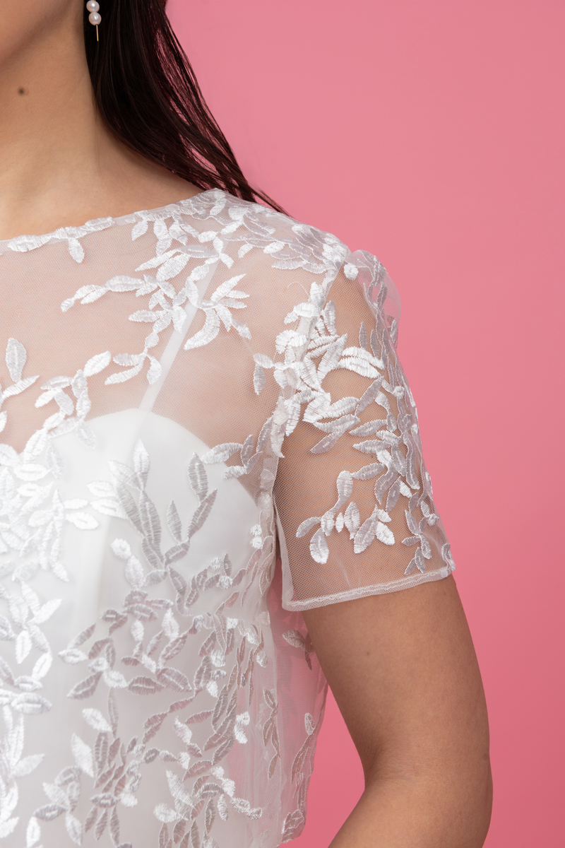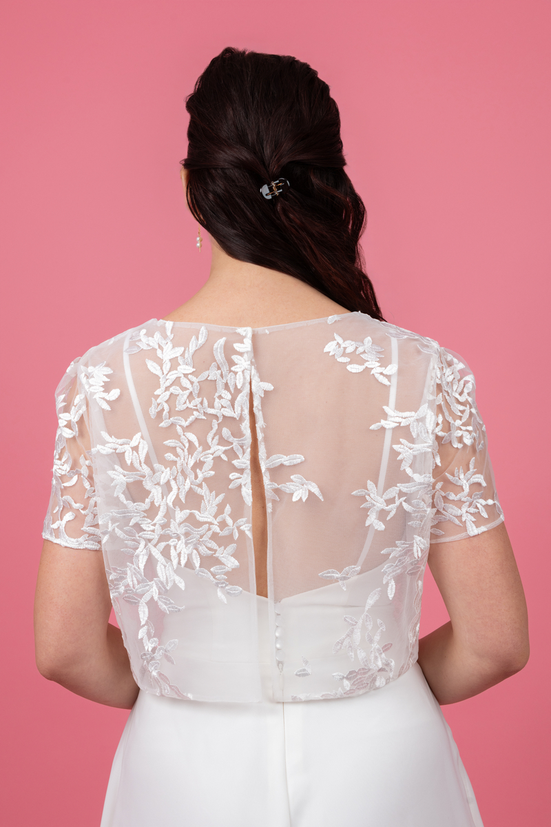 Ce petit haut est la pièce maîtresse qui transforme une tenue simple en un look sophistiqué. Confectionné dans un tulle fin et aérien, il joue sur la transparence pour laisser deviner la peau tout en finesse. Ses motifs végétaux brodés en relief apportent texture et lumière. C’est le choix idéal pour une mariée civile, une demoiselle d’honneur ou une soirée blanche chic.