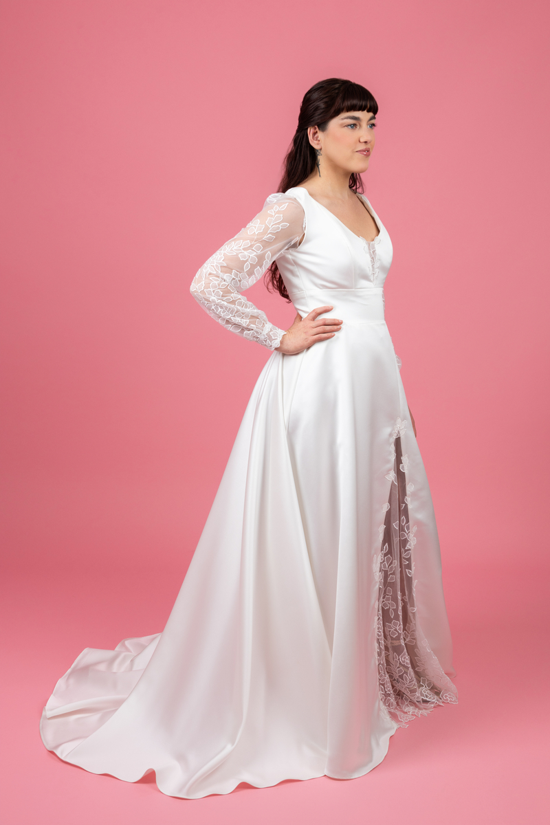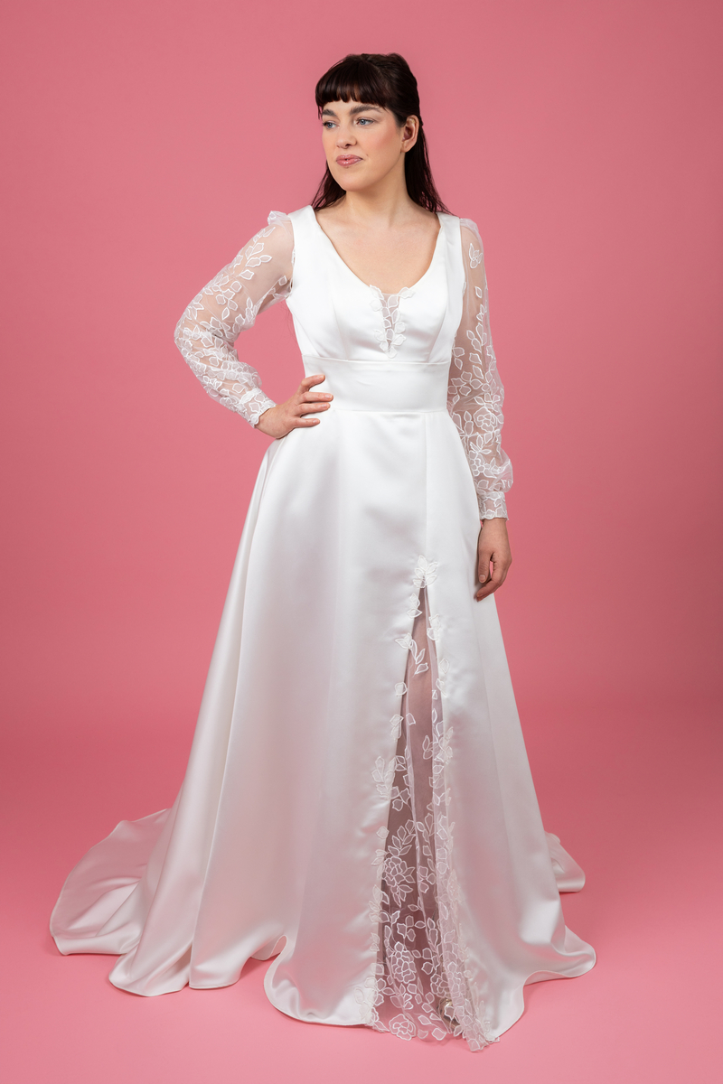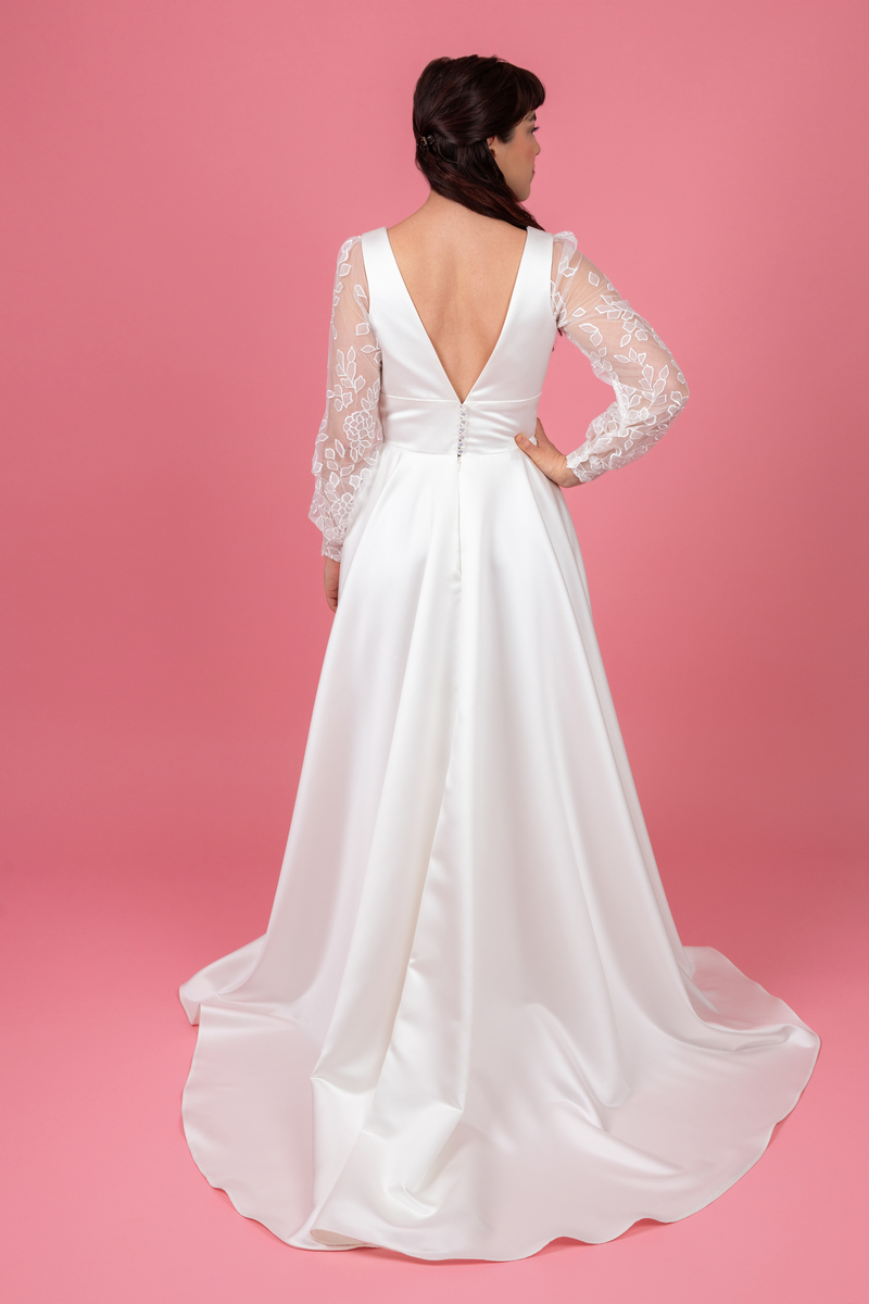 Succombez au charme d’une création modulable qui allie le luxe intemporel du satin duchesse à la modernité d’une coupe structurée. Ce modèle unique offre deux styles grâce à ses manches amovibles. Un buste en satin soyeux avec un décolleté “V” orné d’un délicat empiècement en tulle brodé au centre pour une touche de finesse. La dualité des manches en tulle brodéà porter pour une cérémonie solennelle et à retirer pour une libérer vos épaules lors de la soirée. Une jupe d’un très beau tombée qui révèle une fente audacieux, doublée d’un tulle brodé. Un détail couture qui apporte du relief et de la légèreté à la noblesse du satin.